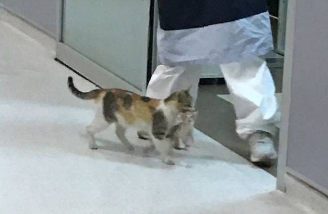 사진에는 엄마 고양이가 의료진 앞에 새끼를 물고 들어와서 새끼를 내려놨다 들었다 하면서 응급실을 이리저리 돌아다니는 모습이 담겼는데요.