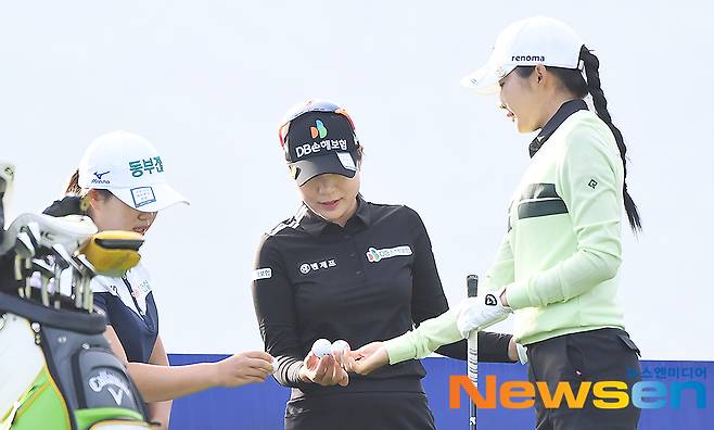 이날 조은혜, 권다원, 정지유가 1번홀 티샷에 앞서 서로 공을 확인하고 있다.