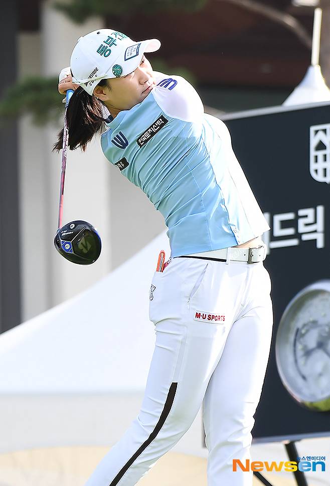 이날 지한솔이 10번홀에서 티샷을 날리고 있다.