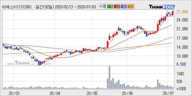 '티에스이' 52주 신고가 경신, 단기·중기 이평선 정배열로 상승세