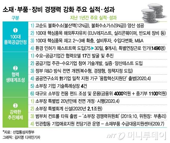 3대 품목 공급 안정 뿐만 아니라 소부장 산업 전반의 경쟁력을 끌어올리는 성과도 거뒀다. 정부는 무역갈등의 장기화가 예상되는 만큼 단기적 대응이 아닌 근본적 '극일(克日)'이 필요하다고 보고 소부장 정책을 추진했다.