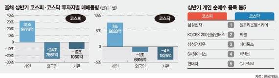 이같은 회복세는 개인투자자들이 급증하면서 증시를 떠받쳤기 때문으로 풀이된다. 상반기 개인투자자들은 코스피에서 31조9776억원, 코스닥에서 7조6633억원 등 총 39조6409억원어치를 '나홀로' 순매수했다. 외국인과 기관의 쌍끌이 순매도에 따른 증시 하락을 방어한 것이다.