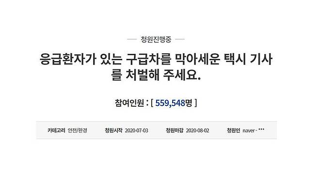 지난 3일 청와대 국민청원 게시판에 올라온 '응급환자가 있는 구급차를 막아 세운 택시 기사를 처벌해 주세요'라는 청원글에는 6일 오후 2시 기준 약 56만 명이 동의했습니다.