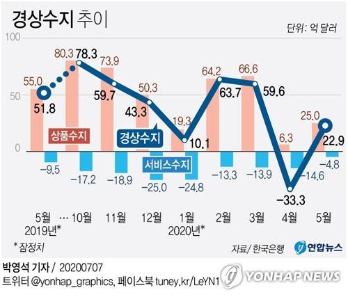 (서울=연합뉴스) 성서호 기자 = 올해 4월 신종 코로나바이러스 감염증(코로나19) 영향으로 1년 만에 적자를 기록했던 경상수지가 5월에는 다시 흑자로 돌아섰다.