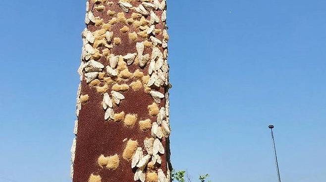 공원에 있는 철제 기둥에 매미나방과 매미나방 알집이 다닥다닥 달라붙어 있습니다.