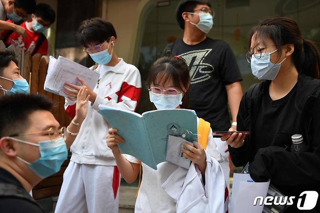 (베이징 AFP=뉴스1) 우동명 기자 = 7일 (현지시간) 베이징에서 코로나19로 한달 연기된 대학 입학시험인 ‘가오카오’를 치르는 마스크를 쓴 수험생이 시험장에 들어가기 전까지 책을 보고 있다.