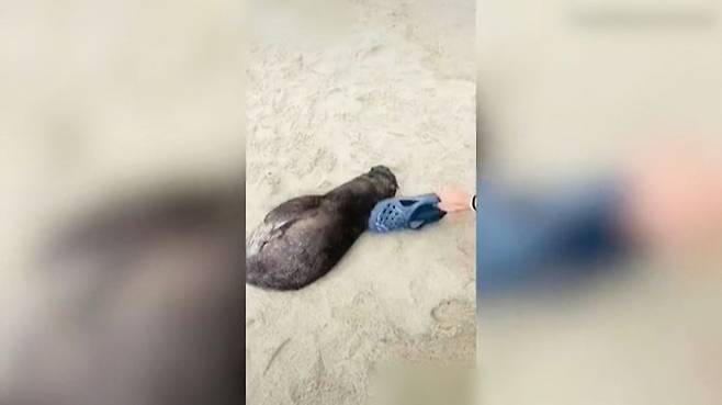 촬영 시점은 알려지지 않았는데요, 모래사장에서 잠이 든 새끼 물개를 여러 차례 보시는 것처럼 슬리퍼로 때려서 깨우는 모습이 담겨 있습니다.