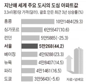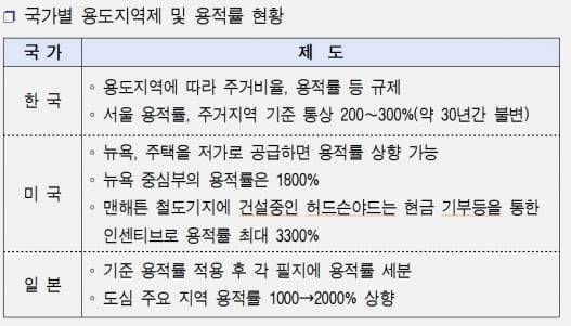 서울 도시지역은 아파트 최고층수가 35층으로 제한된다. 일반상업지역의 기준용적률은 500~600%이고 주거비율은 80% 미만(주거비율에 따라 용적률 제한) 등 규제가 엄격하다. 집값 상승을 먼저 경험한 미국‧일본 등 선진국들은 집값상승 폭등을 막기 위한 방안으로 ‘용적률 인센티브’제도를 시행,도심 주택공급 확대를 통해 집값 문제를 해결하고 있다. 미국 뉴욕의 경우 중심부 용적률이 1800%이고 맨해튼 철도기지에 건설 중인 허드슨야드는 현금 기부 등을 통한 인센티브로 용적률을 최대 3300%까지 허용해주고 있다.
