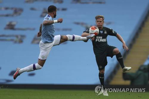 epa08535019 Kyle Walker (L) of Manchester City in action against Matt Ritchie (R) of Newcastle during the English Premier League soccer match between Manchester City and Newcastle United in Manchester, Britain, 08 July 2020. EPA/Lee Smith/NMC/Pool EDITORIAL USE ONLY. No use with unauthorized audio, video, data, fixture lists, club/league logos or 'live' services. Online in-match use limited to 120 images, no video emulation. No use in betting, games or single club/league/player publications.