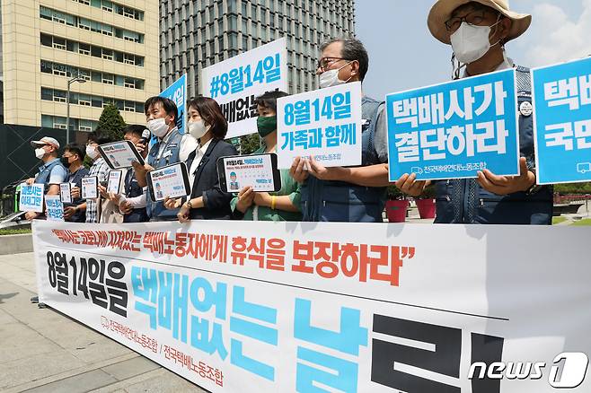 전국택배연대노조원들이 9일 오전 서울 세종대로 광화문광장에서 기자회견을 열고 8월14일을 택배 없는 날로 지정할 것을 촉구하고 있다.