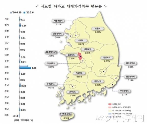 광역시 중에선 세종 아파트값이 주간 2.06% 급등했다. 2013년 집계를 시작한 이래 가장 높은 상승률이다. 2%대는 이번이 처음이다. 지난주에는 1.48% 올랐었다.