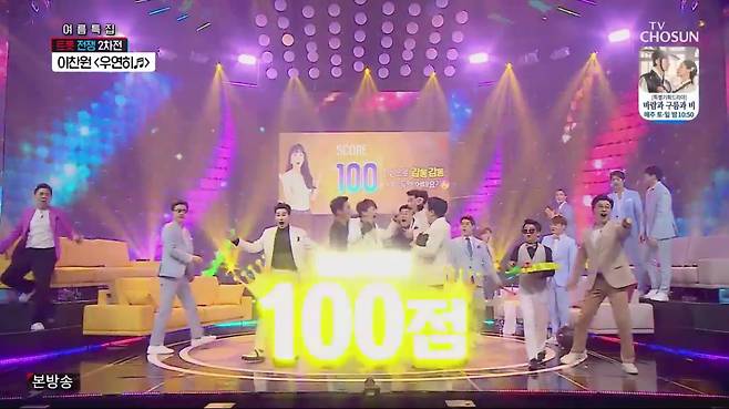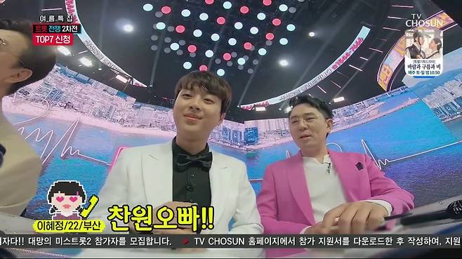 이찬원과 통화한다는 사실에 너무 기뻐 눈물을 보인 신청자에게 MC 김성주는 "이찬원이 어디가 좋은지?" 물었다. 신청자는 "좋은데 이유가 있나요?"라고 되물었다. 이찬원은 여러 번 버튼을 눌러 손가락이 아플 신청자에게 "아프지마 호~"라며 '사랑의 양호실'를 진행했다. '우연히'를 부른 이찬원은 100점을 받아 찬스에 성공, TOP7 470점, 현역7 197점으로 점수 격차를 크게 벌렸다.