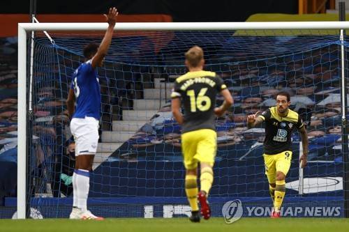 epa08537163 Danny Ings of Southampton celebrates after scoring a goal during the English Premier League match between Everton and Southampton in Liverpool, Britain, 09 July 2020. EPA/Clive Brunskill/NMC/Pool EDITORIAL USE ONLY. No use with unauthorized audio, video, data, fixture lists, club/league logos or 'live' services. Online in-match use limited to 120 images, no video emulation. No use in betting, games or single club/league/player publications.