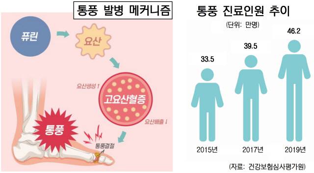 건강보험심사평가원 통계에 따르면 통풍 환자는 2015년 약 33.5만명에서 지난해 46.2만여명으로 40% 가까이 증가했다. 식이·생활습관의 변화로 인한 체중 증가, 수명 연장이 환자 증가의 주요 원인으로 거론된다.
