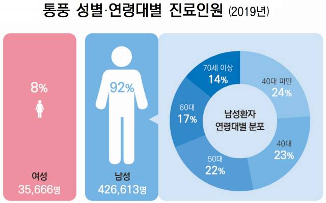 통풍은 40~50대에 첫 증상을 보이는 경우가 많지만 최근에는 육류 비중이 높은 식생활, 패스트푸드를 비롯한 고열량 음식, 잦은 음주, 운동량 감소로 인한 비만 증가 등으로 20~30대 젊은층 환자 비중도 증가하는 추세다.