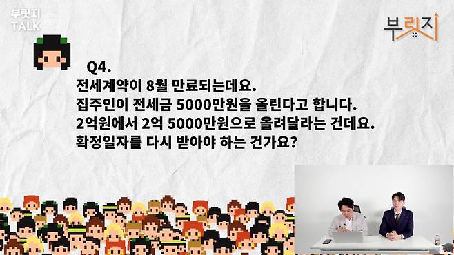 ▶현창윤 변호사 여기서 중요한 개념이 확정일자를 다시 받아야 되냐 이건데요. 확정일자를 맨 처음 계약했던 그때를 기준으로 받고 싶잖아요. 그래야 우리가 보호를 잘 받을 수가 있어요. 그래서 그 취지를 계약서상에 나타내기 위해 특약사항으로 넣어야죠. 특약사항으로 넣던가 그 이전 계약서를 가지고 이전 계약서에서 특약으로 계약을 갱신한다는 취지를 적고 대신에 그 보증금만 올린다라는 취지를 명해 놓아야죠.