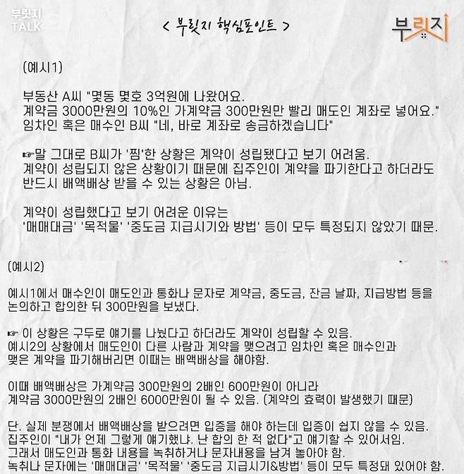 ▶최동수 기자 집주인 입장에서 보면 더 좋은 매수 의견이 오면 100만원 돌려주고 다른 사람이랑 계약을 해주시잖아요. 이때 100만원만 돌려주면 되네요. 두 배를 물어줘야 하나요?