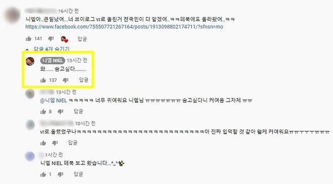 영상을 본 팬들이 "오빠 얼굴이 늘어나있는데요", "브이로그를 보는데 왜 멀미가 나지" 등의 반응을 보이며 영상이 VR 버전으로 잘못 올라온 것 같다고 알려주자 니엘은 댓글에 "아니! 이게 왜 VR로 나온 거지? 다시 올릴게요. 죄송합니다. 뭐야 이거"라며 당혹스러움을 감추지 못했습니다.