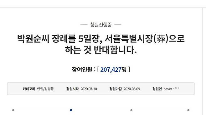 "박원순 서울특별시장(葬) 반대" 靑 국민청원 동의 20만 명 넘어
