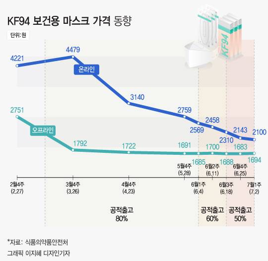 수요도 꾸준히 안정화가 됐다. 3월 둘째 주 3583만장이었던 수요(공공기관 수요 제외)는 4월 넷째 주 2959만장으로 17.4% 줄었다. 정부는 수급이 안정되면 1인 구매량을 4월 27일 3장으로, 6월 18일 10장으로 늘렸다.