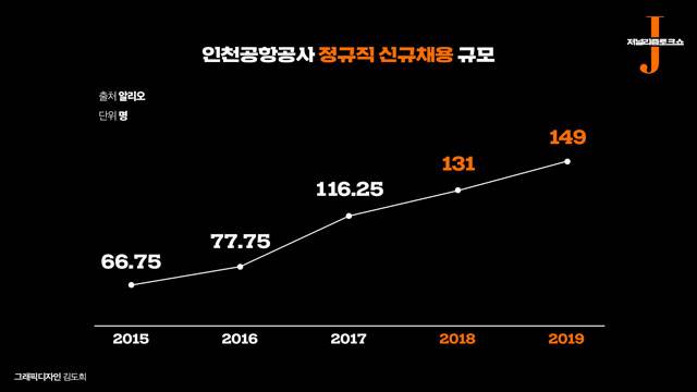 하지만 보안검색요원들의 정규직 전환 이후 인천공항공사의 신규채용 규모가 어떻게 될지는 아직 알 수 없습니다. 최근 인천공항공사의 정규직 신규 채용 규모는 지속해서 증가해왔습니다. 공공기관 경영정보 공개시스템인 '알리오'를 보면 인천공항공사의 정규직 신규채용 규모는 2015년 66.75명, 2016년 77.75명에서 2018년 131명, 2019년 149명으로 해마다 증가하는 추세를 보이고 있습니다. 2018년과 2019년엔 정규직 전환이 시작되기 전인 2015년보다 2배 이상 높습니다.
