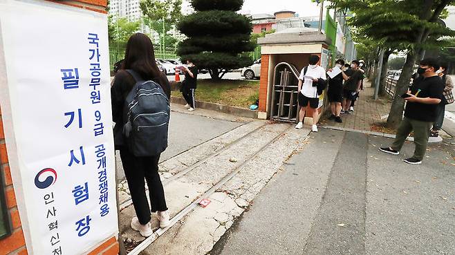 11일 오전 광주 서구의 한 중학교에 마련된 국가직 공무원 9급 필기시험장에서 수험생들이 입실하고 있다. 최근 코로나19 확산세가 이어진 광주에서는 이날 1만2천121명이 지원한 국가직 공무원 9급 필기시험이 27개 시험장, 654개 시험실에서 치러진다.