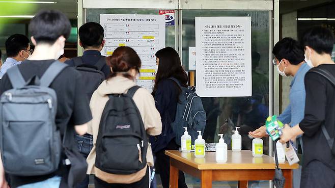 11일 오전 광주 서구의 한 중학교에 마련된 국가직 공무원 9급 필기시험장에서 수험생들이 손 소독을 하고 입실하고 있다.