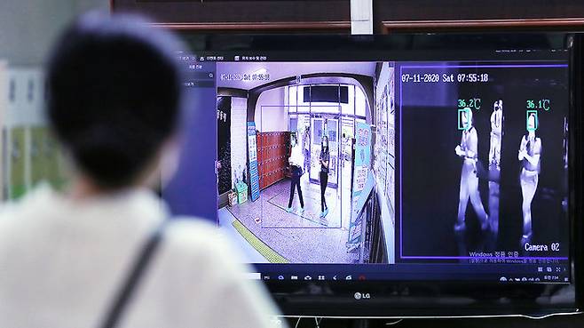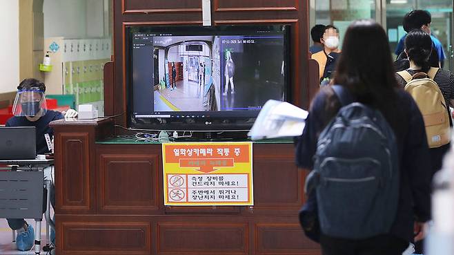 11일 오전 광주 서구의 한 중학교에 마련된 국가직 공무원 9급 필기시험장에서 시험관리관들이 수험생들을 대상으로 열감지기를 활용한 체온 측정을 하고 있다.