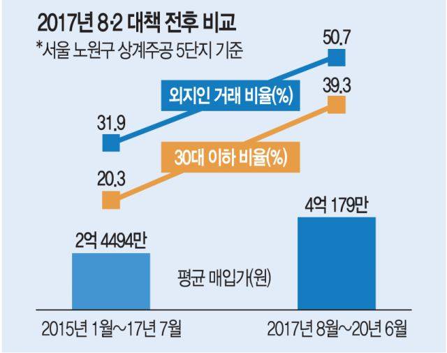 구체적인 매매패턴을 분석해 보니 집값을 올린 현금부자의 정체가 여실히 드러났다. 상계주공5단지는 노원구의 대표적 저가 아파트였지만 창동차량기지 이전과 재건축 이슈 등 개발 호재로 주목받으며 가격이 들썩이기 시작했다. 소문을 먼저 접한 서울사람들이 몰리면서 1차 상승이 이뤄졌고, 그 소문을 들은 지방 사람들이 들어오면서 2차 상승을 이끌었다. 가격이 치솟으면서 내 집 마련의 불안감을 느낀 20, 30대가 막차에 올라섰다. ‘서울사람→외지인→젊은 층’으로 이어진 매수자 행렬은 핀셋 규제의 한계를 드러내는 방증이기도 했다.