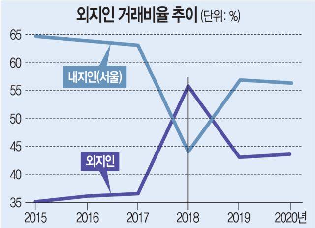 매매 흐름은 2017년 여름을 기점으로 바뀌었다. 2017년 8월부터 지난달까지는 지방 외지인 비중이 50.7%로 늘었다. 연도별로 보면 흐름이 보다 명확하다. 2015~2017년 줄곧 30%대에 머물던 지방 외지인 비중은 2018년 38건(55.9%)으로 서울 매수자 비중(44.1%)을 뛰어 넘었다. 8·2 부동산 대책 이후에도 식지 않은 부동산 광풍이 서울 저가 아파트를 노린 것이다. 지방 외지인 비중은 2019~2020년에도 40%대를 유지해 서울 매수자 비중과 큰 차이를 보이지 않았다. 전체 443건 중 집주인이 지방 외지인으로 바뀐 건 181건(40.9%)이었다.