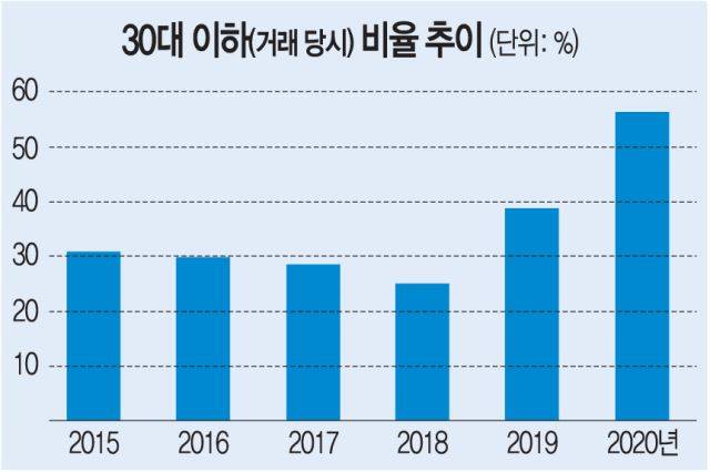 가격이 오른 아파트에 마지막으로 올라탄 건 젊은 층이었다. 거래 당시 20~30대였던 매수자 비중은 2015년 30.9%에서 2020년 56.25%로 뛰었다. 8·2 대책이 나오고 서울에 집을 사는 게 더 어려워진 2017년 8월을 기점으로 보면 1980년생 이하의 거래 비중은 20.3%에서 두 배 가까운 39.3%로 늘어난다.