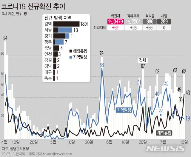 [서울=뉴시스]13일 오전0시 기준 코로나19 신규 확진환자가 62명이 발생했다. 신규 확진환자 중 19명은 지역발생, 43명은 해외유입이다. (그래픽=안지혜 기자)
