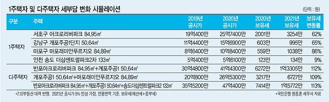 조정대상지역의 2주택 이상 다주택자는 대부분 사정이 비슷하다. 공시가 10억8400만원인 서울 마포구 마포래미안푸르지오 84㎡에 거주하면서 강남구 개포주공1단지 50.64㎡를 보유하고 있는 B씨는 올해 3217만원(재산세 771만원, 종부세 2446만원)인 보유세를 내년엔 두 배가 넘는 6727만원(재산세 885만원, 종부세 5842만원)을 내야 한다.