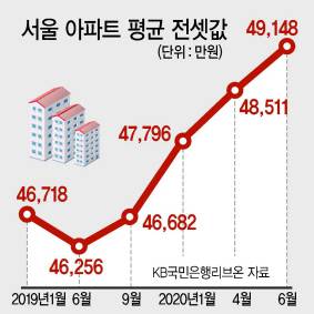 전셋값 상승 추세가 이어지는 것을 감안하면 세입자는 불안하다. KB국민은행 리브온에 따르면 지난 2019년 4월 이후 서울 아파트 평균 전셋값은 올해 6월까지 단 한 차례도 빼놓지 않고 올랐다. 이 기간 4억6210만원에서 지난달 4억9148만원으로 5억원 턱밑까지 올랐다.
