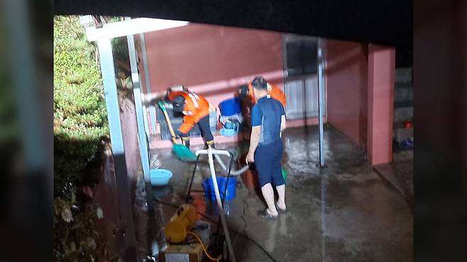 오늘(13일) 새벽 3시쯤 전남 장성군의 한 주택에서 소방대원들이 삽을 이용해 주택 마당에 가득 찬 물을 퍼내고 있습니다.