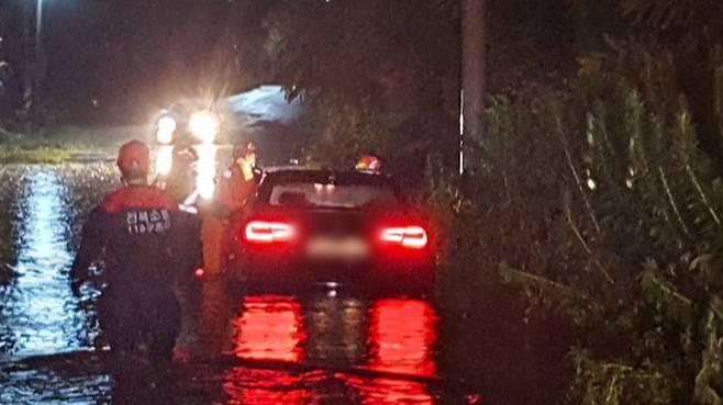 어젯밤 11시 30분쯤 전북 김제시에서는 침수된 도로 위를 지나려던 승용차가 고립되는 사고가 있었습니다.