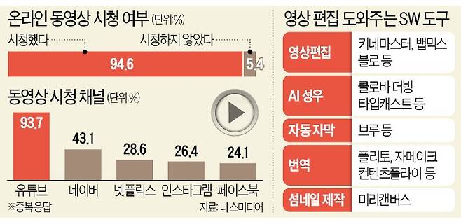기업들이 영상 편집툴 서비스에 진출하는 이유는 영상 시장의 폭발적인 성장세 때문이다. 미디어렙(광고판매대행) 기업인 나스미디어에 따르면 인터넷 이용자의 94.6%가 동영상을 시청하는 것으로 나타났다. 동영상 시청에는 유튜브 앱을 가장 많이 이용했다.