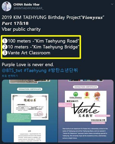 바이두뷔바는 지금까지 다양한 서포트는 물론 공익사업과 기부활동에도 지속적으로 참여해왔는데요, 최근에는 중국 산시성 남서부 조계촌 마을의 열악한 통학 환경에 놓인 초등학생들을 위해 100m 길이의 도로 '김태형로'와 10m 길이의 다리 '김태형교'를 만들어 뷔의 이름을 빛냈는데요, 이후 이 도로와 다리는 '김태형 사랑길'로 명명됐습니다.