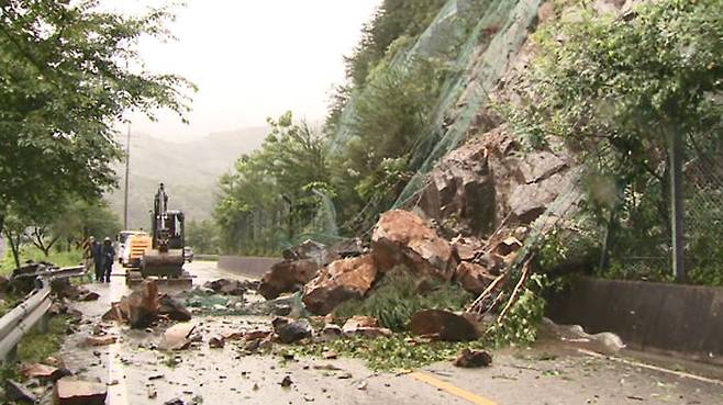 산비탈에서 쏟아져 내린 바윗덩이로 도로가 막히고 끊기기도 했습니다.