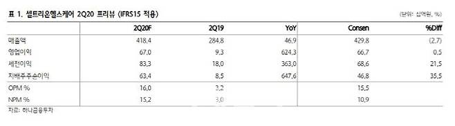 선민정 하나금융투자 연구원은 "셀트리온헬스케어의 2분기 매출액은 전년 동기 대비 약 17% 증가한 4184억원, 같은 기간 영업이익은 약 624% 증가한 670억원(영업이익률 16%)으로 추정된다"며 "미국향 인플렉트라가 작년에는 분기별로 평균 250억원씩 발생하면서 연간 1000억원 가량의 매출을 기록했다면 올해는 연간으로 약 2000억원 이상 발생할 것으로 예상돼 분기별로는 안정적으로 약 500억원 이상 매출을 기록할 것"이라고 분석했다.