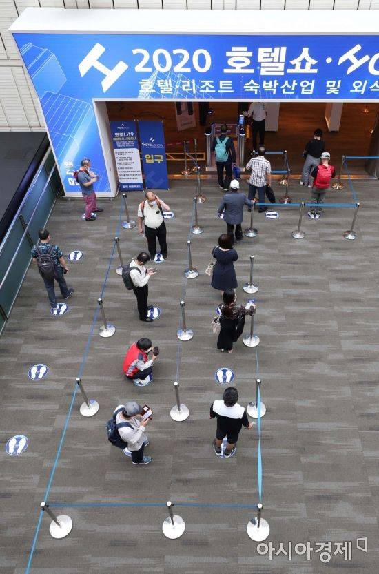 14일 서울 강남구 코엑스에서 열린 '2020 호텔쇼'에서 시민들이 신종 코로나바이러스 감염증(코로나19) 예방을 위해 거리를 둔 채 입장을 기다리고 있다. /문호남 기자 munonam@