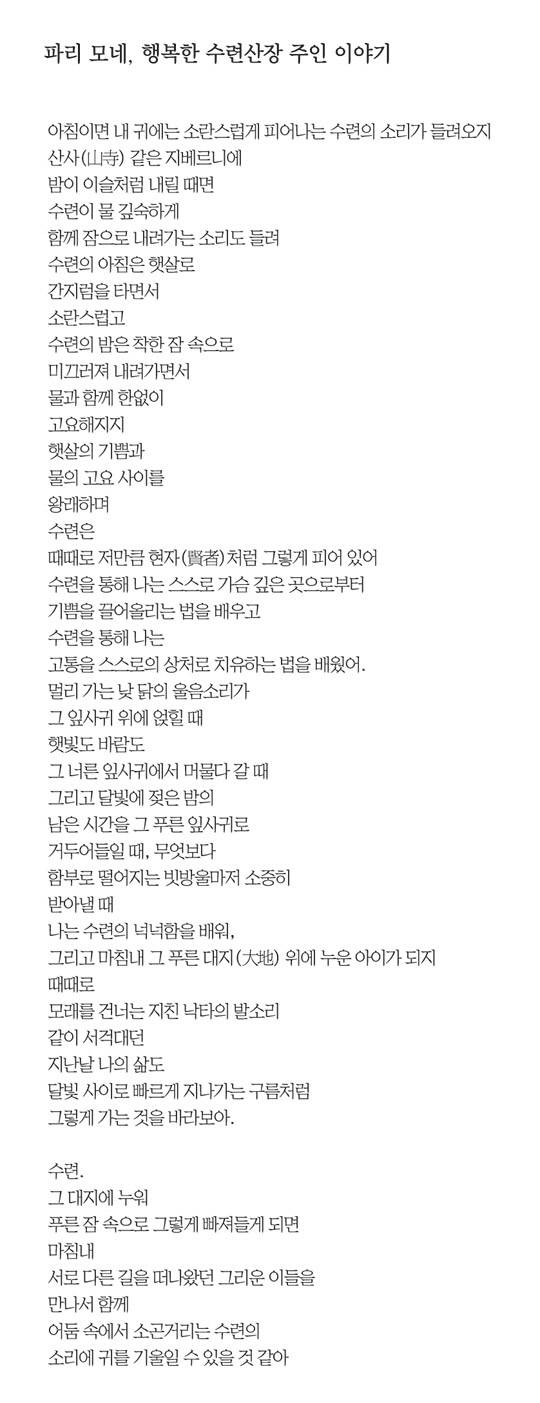 내가 나비인가 나비가 나인가(장자(莊子)‘호접몽’에 나오는 이야기다). 만년의 클로드 모네도 그렇게 중얼거렸음 직하다. 내가 수련인가, 수련이 나인가. 그만큼 그와 수련은 주체와 객체로 나눌 수 없어 보인다. 그야말로 물아일체(物我一體)다. 그의 수련은 파리에도 뉴욕에도 런던에도 베를린에도 그리고 멕시코시티에도 도쿄(東京)에도 사시사철 동시다발적으로 그 꽃을 피운다.