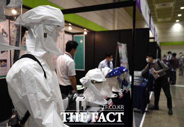 [더팩트ㅣ임세준 기자] '2020 호텔쇼' 박람회가 14일 오전 서울 강남구 삼성동 코엑스에서 열린 가운데 코로나19 방역과 관련한 다양한 제품이 전시되어 있다.
