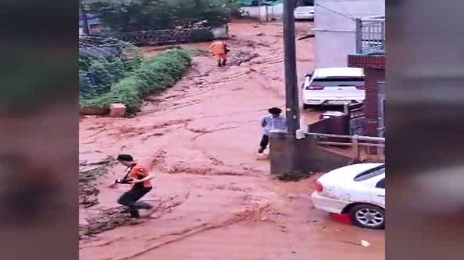 산에서 밀려 내려온 흙탕물이 마을로 쏟아집니다.