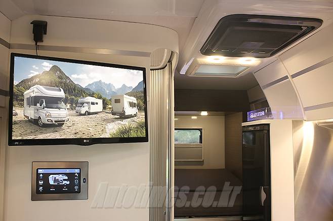 캠핑카의 핵심인 카라반은 차체보다 튀어나온 면적이 작지 않은 만큼 공간이 넓다. 내부는 잘 꾸민 모델하우스처럼 정돈돼 있다. 전동식으로 움직이는 품목은 적절한 곳에 스위치를 배치해 직관적이고 안전하다. 메인 도어 안쪽엔 간이 쓰레기통을 설치했다. 문을 활짝 연 상태로 고정 가능하며 모기장만 여닫을 수도 있다. 출입구 왼쪽엔 LG 24인치 모니터와 터치식 통합 컨트롤러를 장착했다. 통합 컨트롤러는 캠핑에 필요한 보조배터리의 잔량과 조명, 난방 등의 설정을 한눈에 보여준다. 블루투스를 활용해 스마트폰으로도 조절할 수 있다.