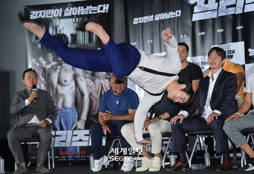 배우 왕휘가 16일 오후 서울 용산 CGV에서 열린 영화 ’프리즈너’의 언론시사회에 참석해 멋진 액션 연기를 선보이고 있다.