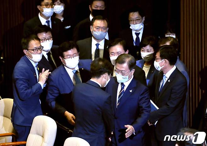 (서울=뉴스1) 박세연 기자 = 문재인 대통령이 16일 오후 서울 여의도 국회에서 열린 제21대 국회 개원식에서 개원연설을 마친 뒤 본회의장을 나서며 의원들과 인사하고있다. 2020.7.16/뉴스1