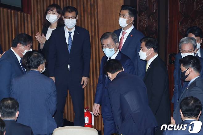 (서울=뉴스1) 박세연 기자 = 문재인 대통령이 16일 오후 서울 여의도 국회 본회의장에서 열린 제21대 국회 개원식에 참석, 더불어민주당 김태년 원내대표 등 의원들과 인사하고 있다. 사진 오른쪽은 김영춘 국회 사무총장과 노영민 대통령비서실장 2020.7.16/뉴스1