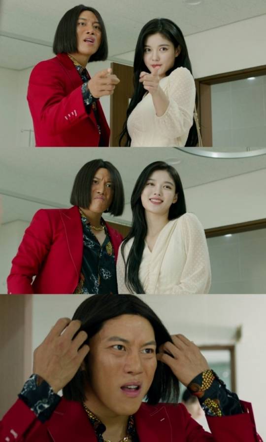 무엇보다 음문석은 극중 한달식의 모습이 아닌 ‘열혈사제’ 장룡의 모습으로 나타나 흥미를 자아낸다. 찰랑거리는 단발머리, 험상궂은 표정, 촌스러운 빨간 슈트 스타일링까지, 장룡의 모습 그대로다. 김유정은 장룡의 모습을 한 음문석을 친근하게 대하고 있어 호기심을 증폭시킨다. 과연 이 상상도 못한 조합이 나오게 된 극중 배경은 무엇일까.