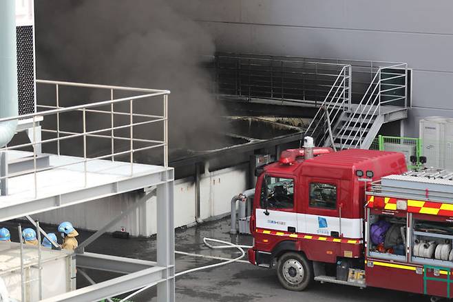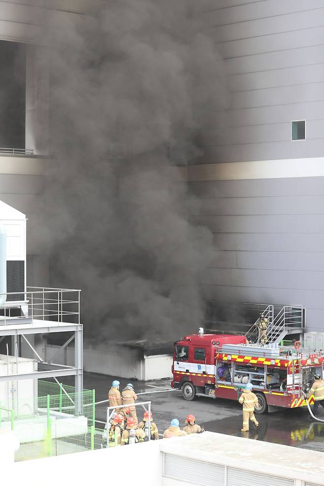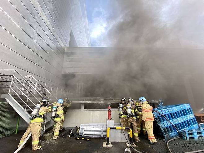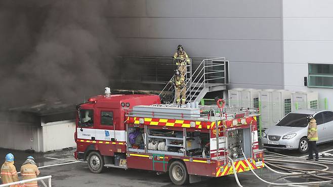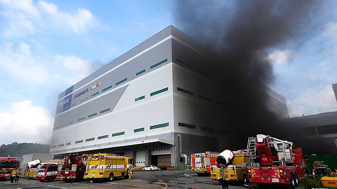 21일 오전 경기도 용인시 처인구 양지면 제일리의 한 물류센터에서 불이 나 소방대원들이 진화작업을 하고 있다.